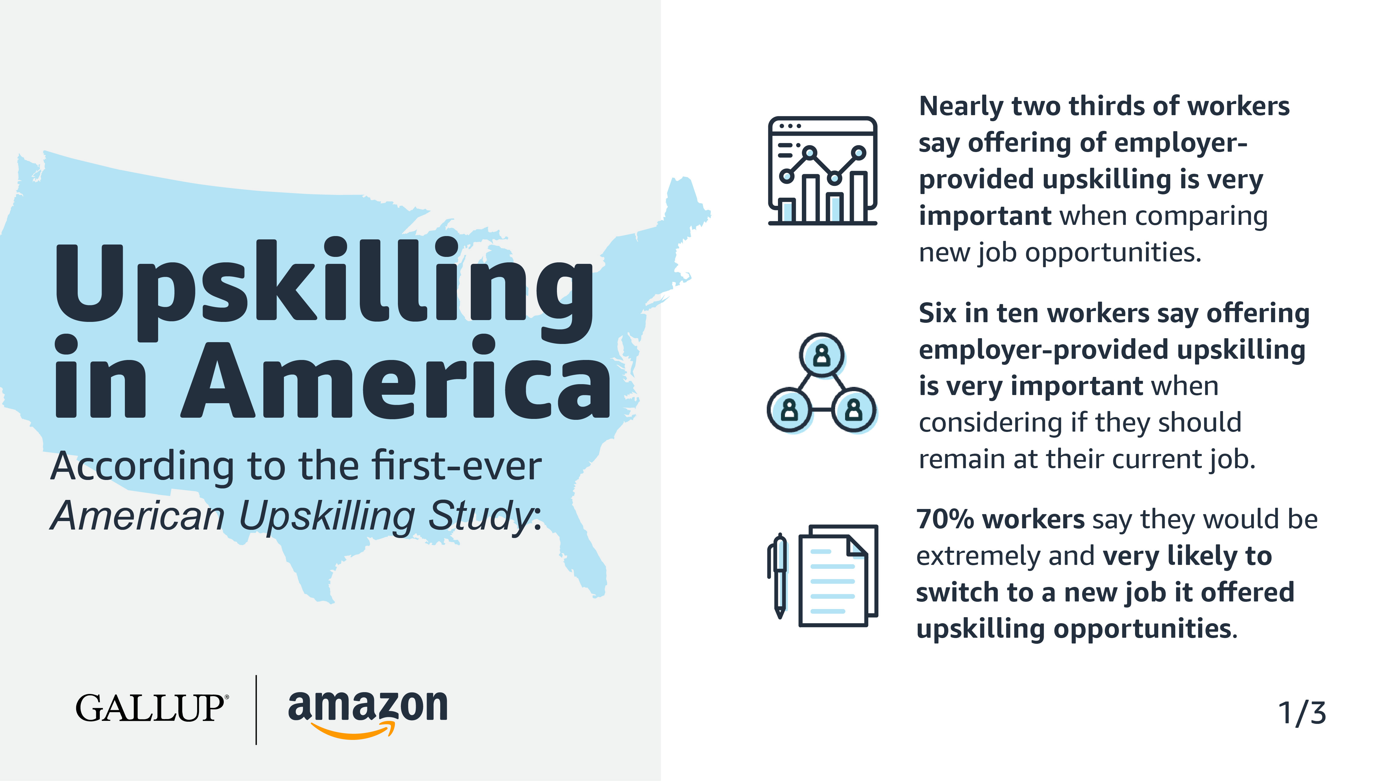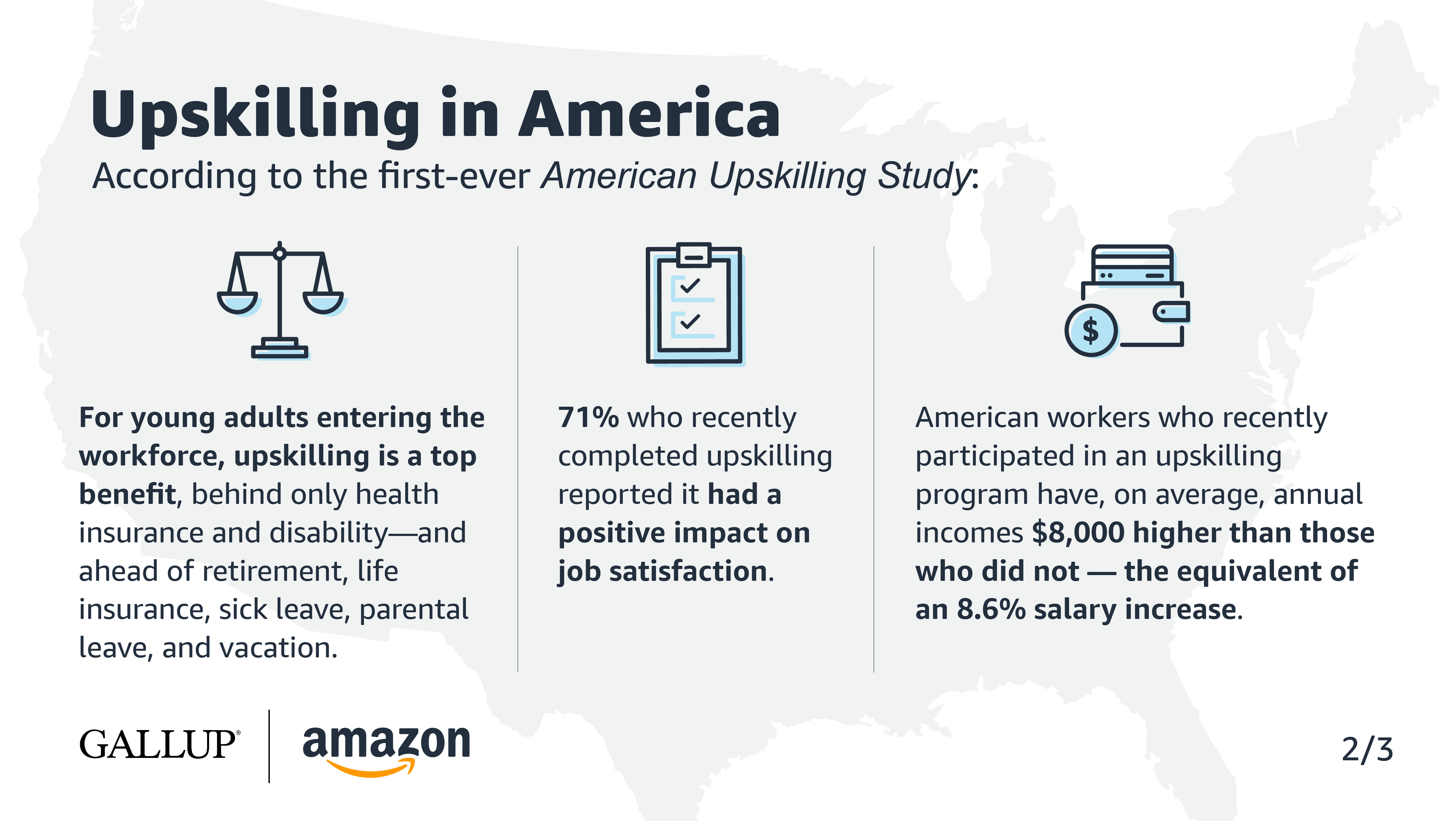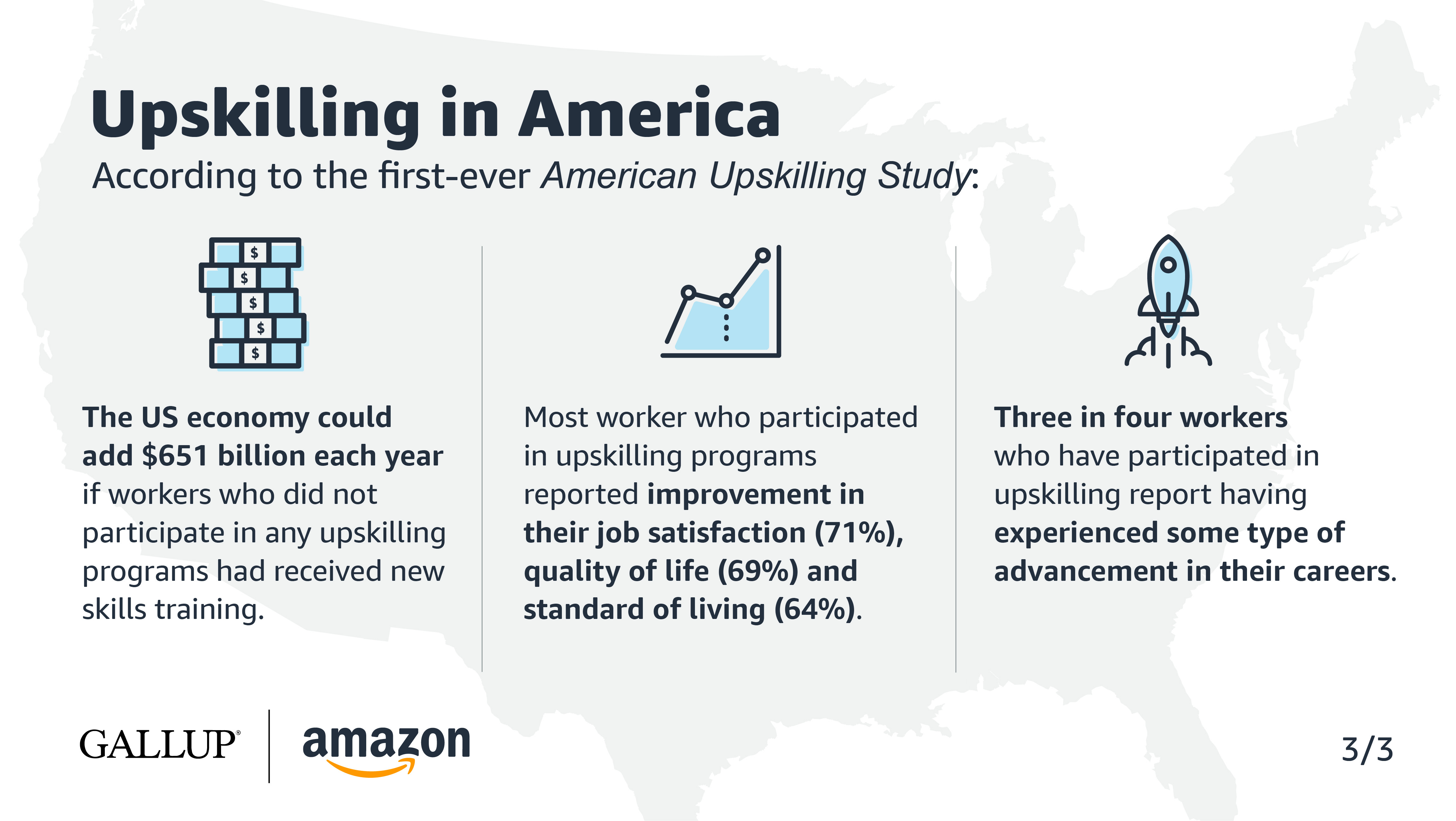 亚马逊的投资为员工免费教育计划之际,美国首次Amazon-Gallup Upskilling研究显示如何获得技能培训可以帮助企业招募更多的员工,帮助员工建立职业技能奖励。分析发现,美国工人完成upskilling项目过去一年平均工资增长8.6%——相当于一个额外的8000美元的年度收入。